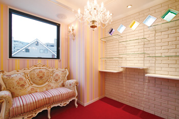 | ソファやシャンデリアがゴージャスな雰囲気を醸し出す。大きく開口したFIX窓からは明るさを取り込み、ガラスブロックが空間にアクセントを添えている | 店舗専用階段に取り付けられた手すりは、奥様が見つけた名古屋にあるアイアンの店とやりとりをして製作してもらったという |