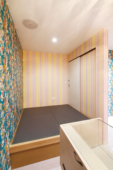 外の専用階段から直接つながる店舗スペースは、近々婦人雑貨のセレクトショップを開きたいという奥様の夢を形にした空間。増築で広さを増し、奥には畳下収納を備えた小上がりの畳スペースが。これは、開業した後も子どもさんが側で宿題などできるようにと考えたため。床は、入口をタイル、奥は絨毯と、あえて変化をつけたという。