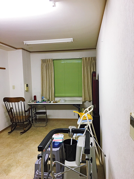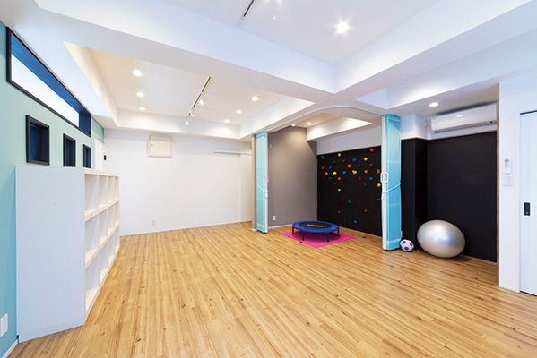 | 多目的に使える4階の部屋。鍵付きのロッカーや、折り畳みベッドなど大きいものも入る収納スペースを備えた | ペパーミントカラーのクロスが映えるフロア。壁にはボルダリングを設け、一角をアコーディオンカーテンで仕切れるようにした |
