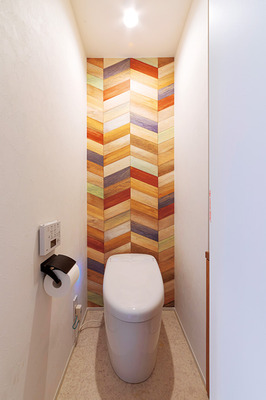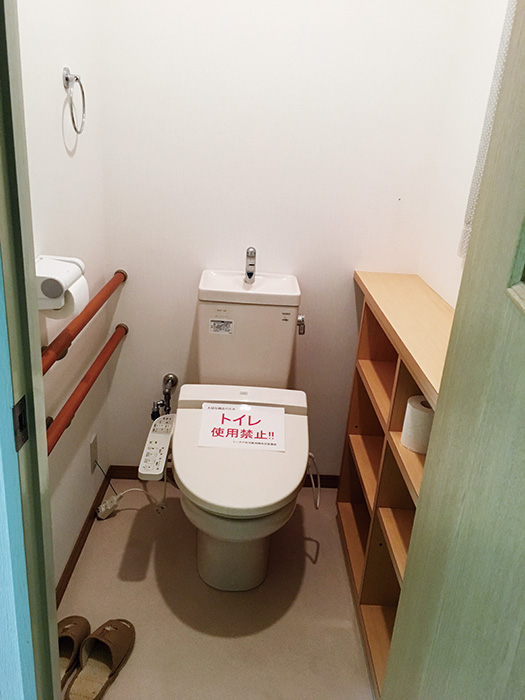 | トイレはタンクレスを採用してスッキリと。ヘリンボーン柄の壁紙を一面に張っておしゃれに | 利用者やスタッフが出入りするエントランスには、手すりやげた箱を新設 |