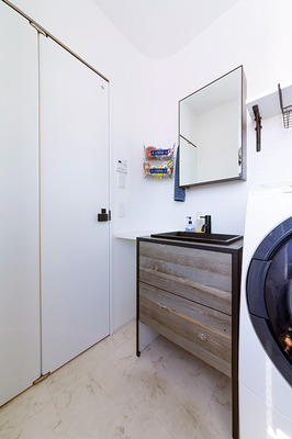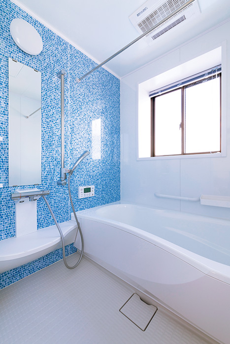 | リビング横に配置された、シンプルながら個性的なデザインの洗面台を据えた洗面室 | ブルーのアクセントパネルが清潔感を漂わせる浴室。システムバスは1616サイズを採用 |