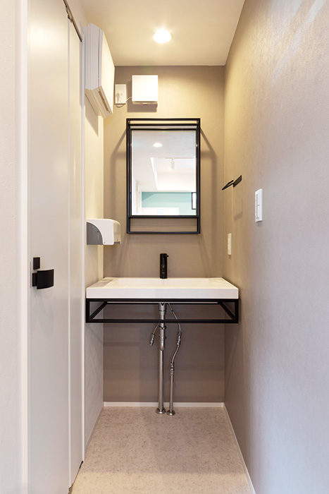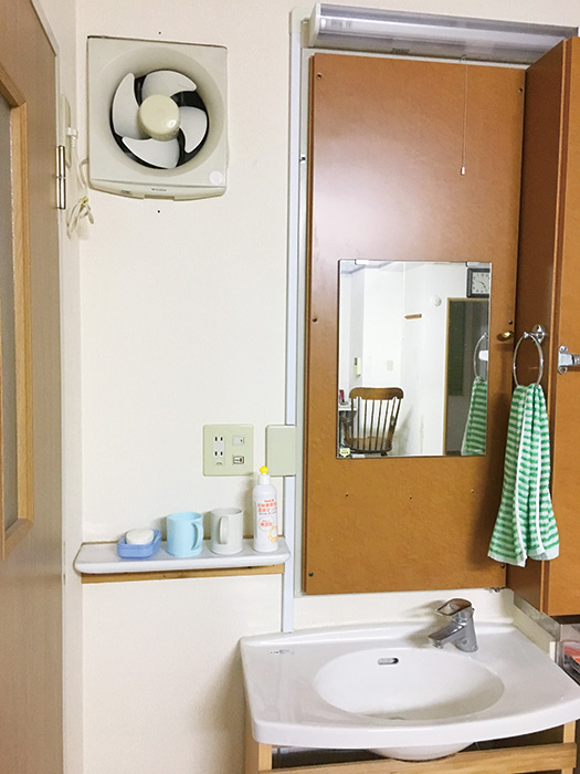| 法律上必要な、利用者の管理を行うスタッフを配置しておくための部屋をフロア隣に確保 | 利用者が使うための洗面台がフロアの横に配置されている |