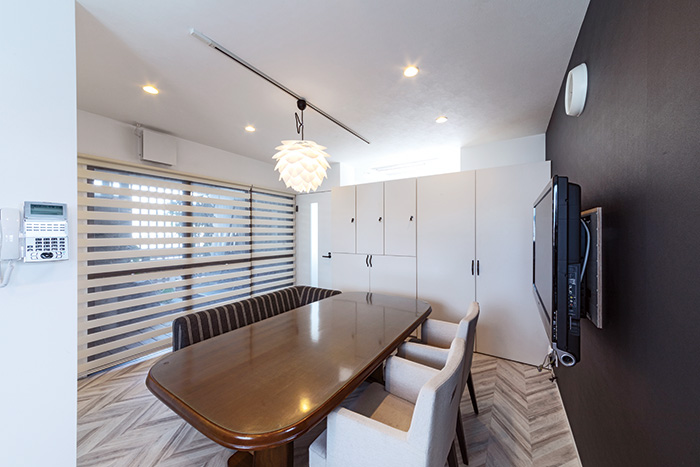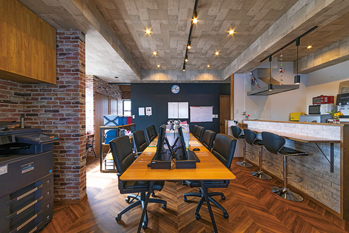 新しくなった事務所は、1つのテーブルを囲むようにスタッフの椅子が並び、「スタッフ間の距離が縮まり、親密感が高まったように感じます」とM様。5階に暮らす次女は「思い通りの住まいになって満足です」とのこと。リノベーションで生まれ変わったビルに、会社と家族の新たな歴史が刻まれ始めた。