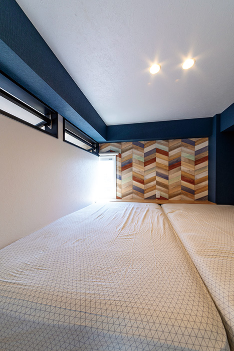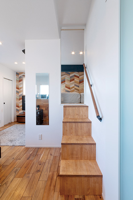 | 5階の寝室は、右側に階下へ続く階段があるため段差を設けて配置。寝室への階段は収納を兼ねている | 床の高さを1m上げ、ロフトのような形で設けた寝室。すべり出し窓を開口し、通風にも配慮 |
