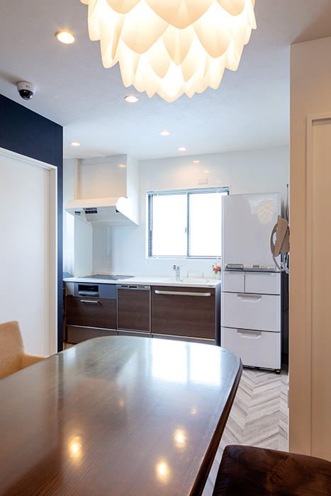 1階のエントランスを一新し、2階は新たに始める障害児の学童保育を目的とした『放課後等デイサービス』のための部屋に。3階は会社の事務所だが、まるでカフェのような雰囲気が印象的。スタッフが入れ替わりながら長時間過ごすため、飲食がしやすく、料理研修もできるようキッチンまで備えた。4階は多目的室とし、ここにもキッチンを設置。そして5階は次女の家族5人が暮らす住居にした。