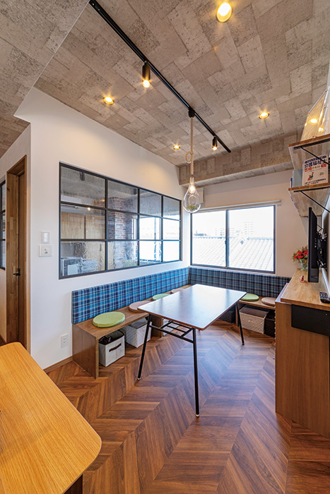 | 窓際はL字型にベンチを設け、打ち合わせスペースに。クッションフロアはヘリンボーン柄 | 3階と同様、料理研修ができるようキッチンを併設している |