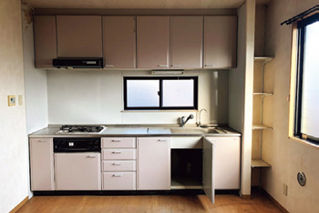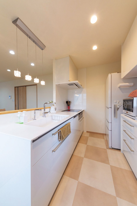 | 以前はダイニングキッチンが隣り合う洋室との壁に仕切られていたが、洋室との境の壁を取り払ったことで、以前の倍近く広い空間を実現した | 手元を隠しながら調理できるオープンな対面キッチン。耐水性に優れたフロアタイルの床は油汚れも拭き取るだけで手入れも簡単 |