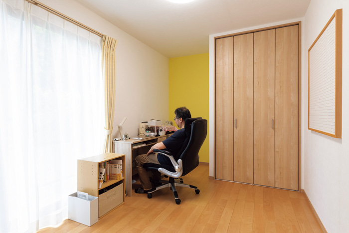 | 独立した洋室を取り込み、明るく広く生まれ変わったリビング。無垢のカバザクラを採用した床、手塗り風の印象が美しいクロス張りの白い壁が、面積以上の広がりを感じさせる | 押し入れと床の間があった和室を多目的に使える洋室へリフォーム。押し入れはクロゼットに変更、床の間の奥行きを残し、壁には黄色のアクセントクロスを採用。現在はご主人がデスクを置き書斎代わりに。将来は子ども部屋へと、幅広く活用する予定 |