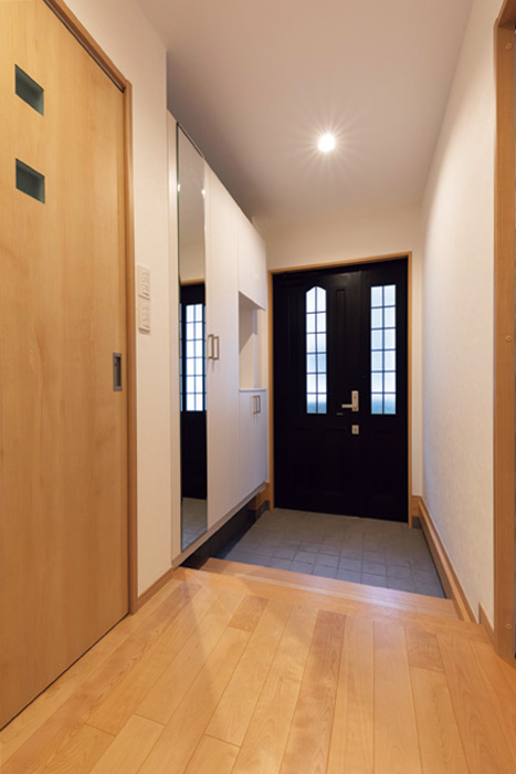 ゼネコンに勤めていたお父様が建てた重量鉄骨構造の家は、ホール空間とトイレが通常の家よりも広く、間取りを設計する上で大きなポイントだった。ホールの広さ、居室・水回りへの動線を分ける使い勝手の良さは残し、男性用便器もあったトイレは半分の広さに減築、そのスペースを収納へと再生。和室は将来の子ども部屋を想定して洋室に変更、玄関横の洋室は収納を余裕のあるウォークインクロゼットへとリフォーム、新しい住まいにふさわしく使い勝手を高めている。 親世帯となる1階には外階段と廊下からつながる内階段で移動、出入り 口となる引き戸は新しい造作扉へ。お互いのプライベートに配慮しながら、意識し合える距離が確保されている。水回り設備は同じ会社の製品に統一。メンテナンスなどを頼むときも安心とご主人がこだわった。見映えと実用性のバランスも見習いたい。