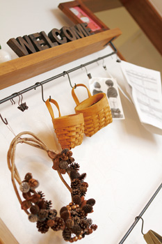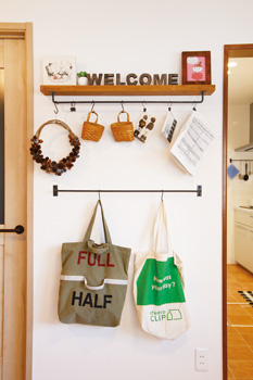 | 学校からの連絡事項のプリントも、小物やエコバッグと一緒に吊るしておけば、整理整頓できてこんなにスタイリッシュに | 奥様が拾ったつるや木の実で作るリースも、アイアンやフックを使ってディスプレー。こまごました物もすっきり片付く |