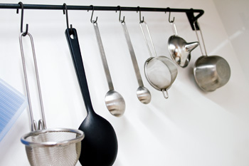 | 使う頻度の高い調理器具は、すぐに取り出したり片付けやすいようにと、壁にアイアンを取り付け、フックで吊り下げる形に | 当初はキッチンの壁全体に貼るつもりだったというモザイクタイル。掃除のしやすさを考慮して、貼るのは一部にし、アクセントに |