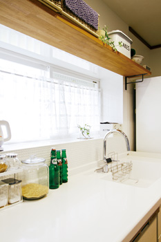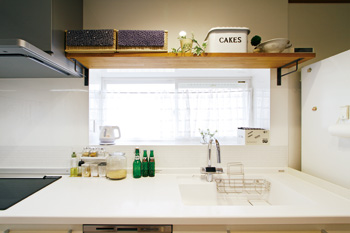 キッチン、リビングダイニング、和室の窓には内窓を設置。キッチンは吊り戸棚を撤去し、収納兼ディスプレー用の棚を取り付けてシステムキッチンを一新。リビングダイニングはクロスと床を貼り替え、PCカウンターとテレビ台を造作。和室は仏間と床の間を撤去して収納スペースを確保。廊下の壁は白いレンガ風のクロスに貼り替えた。
