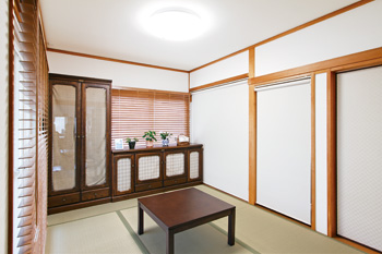 | リビングとの間を仕切る引き戸の和室側には、市松模様が入ったクロスを貼って和の雰囲気に | 右手の2つのロールスクリーンは、普段は開放しておいて来客時に簡単に目隠しできる方が便利と考え、扉の代わりに取り付けた |