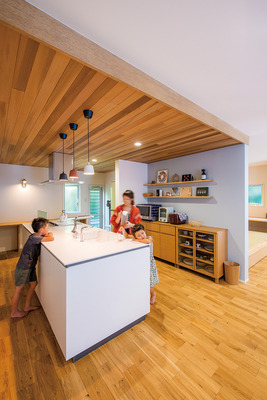 間取りは、親戚が集まるときのことを考えて、親世帯にあった和室を取り込んでLDKを広くし、あらたに小上がりの畳コーナーを配置。キッチンは耐震壁との関係から、向きを変えて中央にアイランド型を据えた。もともと応接室だった場所は書斎とし、裁縫をする奥様や近所に暮らすお父様がパソコンを使うこともできる部屋に。2階は子どもたちの部屋とプレールーム、寝室として内装を一新したが、コストを考えて家族が主に過ごす1階に注力したリフォームを実践。1階の床は全てラスティックオークの無垢材を採用し、耐震補強にも万全を期した。
