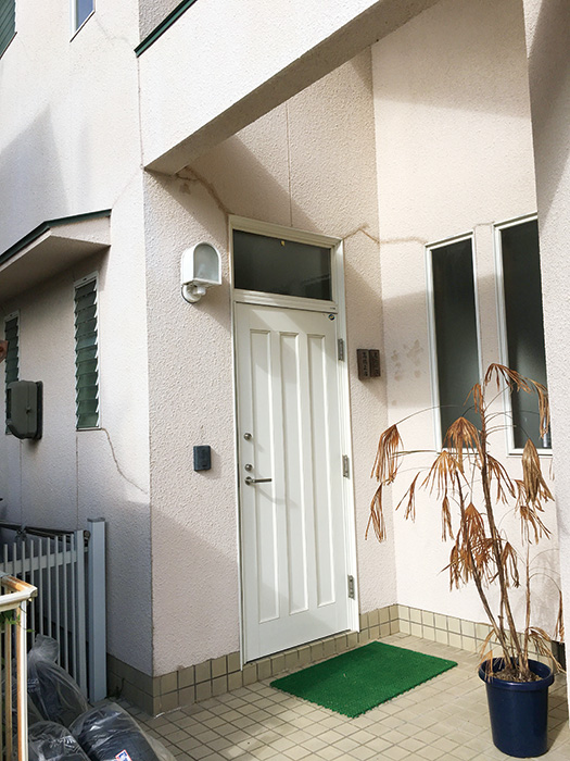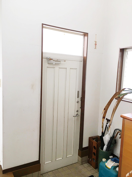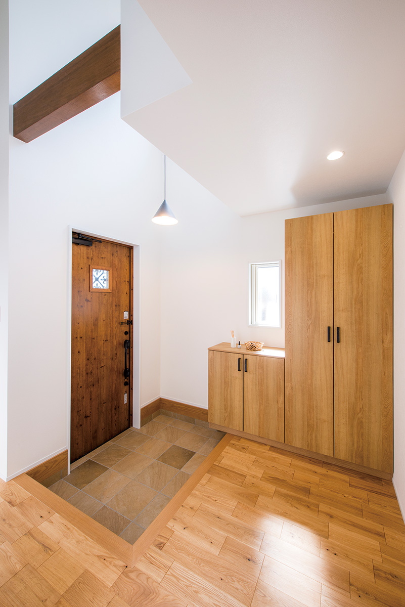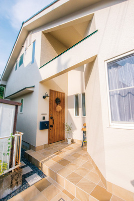 | 外壁は以前と同系色の塗料で塗装し直し、玄関ポーチにはテラコッタタイルを並べて南欧風の雰囲気を醸し出している | 玄関ドアは温もりと重厚感ある木製ドアに替え、土間はタイルを張り替えた。玄関収納は廊下床の無垢材に合ったものを選択 |