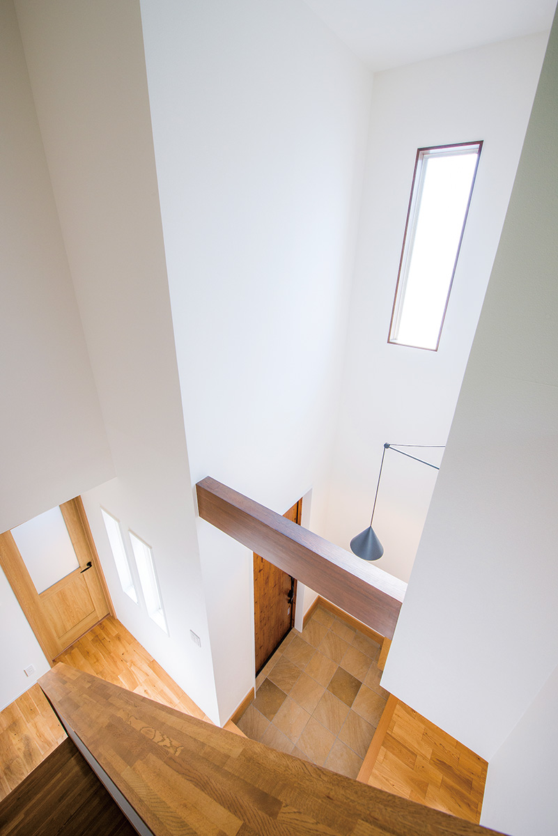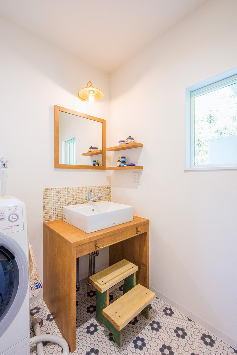 | 造作を希望した洗面台。レトロなデザインの照明は、奥様からイメージを聞いてプランナーが選択 | 吹き抜けのFIX窓から明るさがもたらされる開放的な玄関。クロスと框を取り替え、床はLDKと同じ無垢材で温もりを創出 |