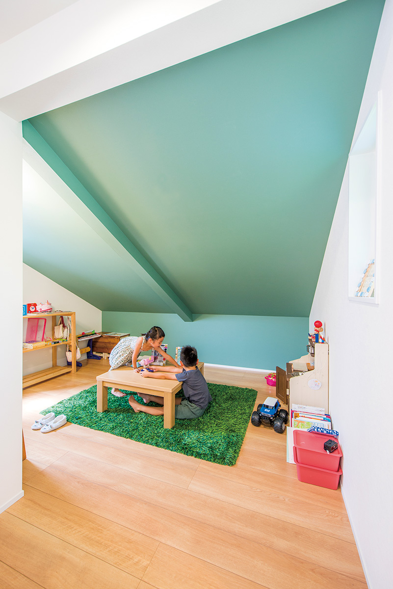 | キッチンの窓側にはカウンターを造作。家事をしたり、子どもたちがお絵描きするなど、多目的に使える | 収納スペースだった小屋裏は引き違い扉をなくし、プレールームとして活用。勾配天井にはペパーミントカラーのクロスを張って明るい空間にした |