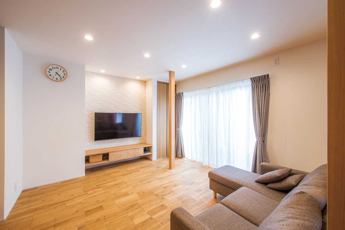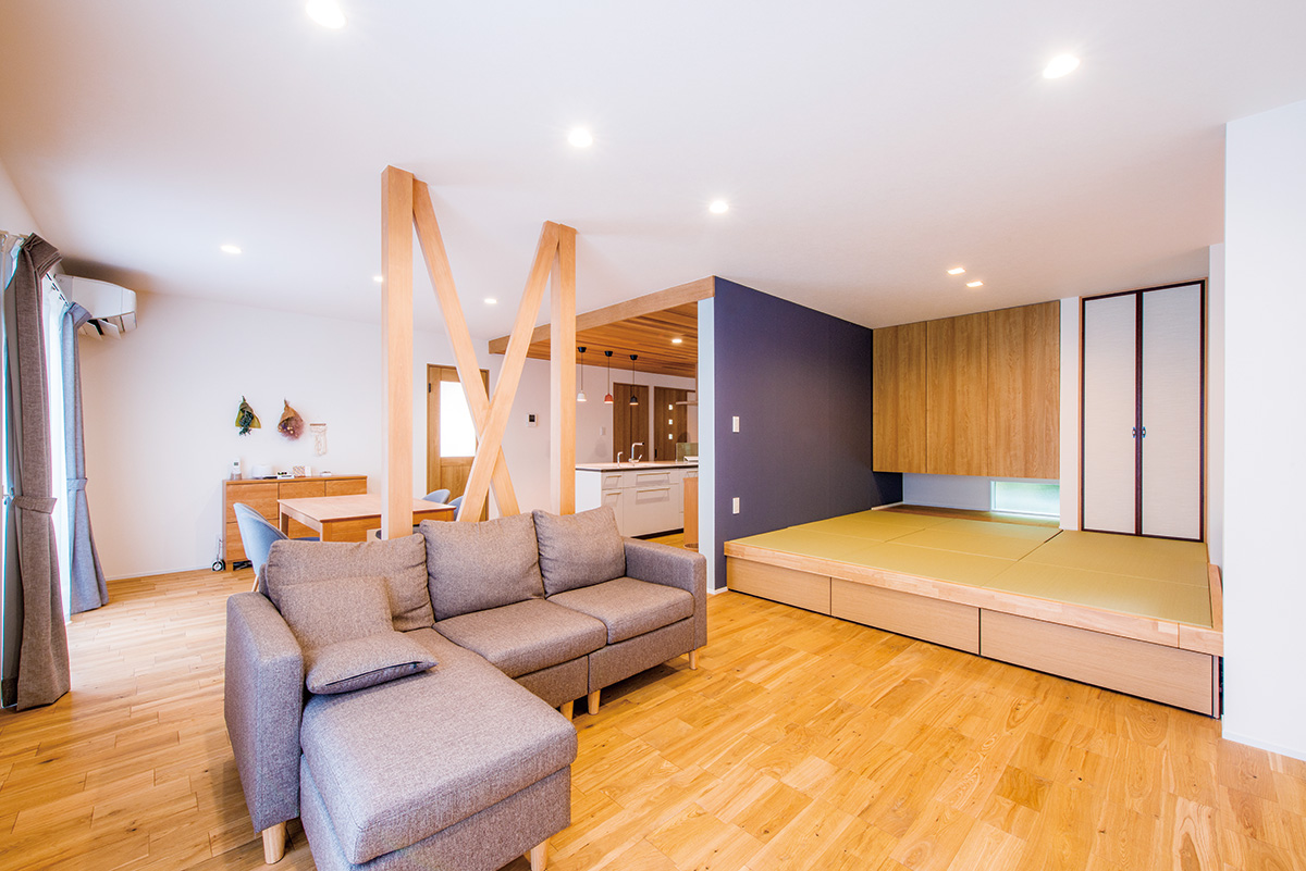 | 壁をなくし、天井を支えるための筋交いを設けたリビング。小上がりの畳コーナーは、親戚など人が多く集まった際にベンチ代わりになる。キッチンとの間の壁のクロスは、両面で異なる色に | リビングの窓側には柱をあらたに増やして耐震補強。テレビボードは造作し、テレビ背面の壁にはエコカラットをあしらってスタイリッシュなコーナーに |