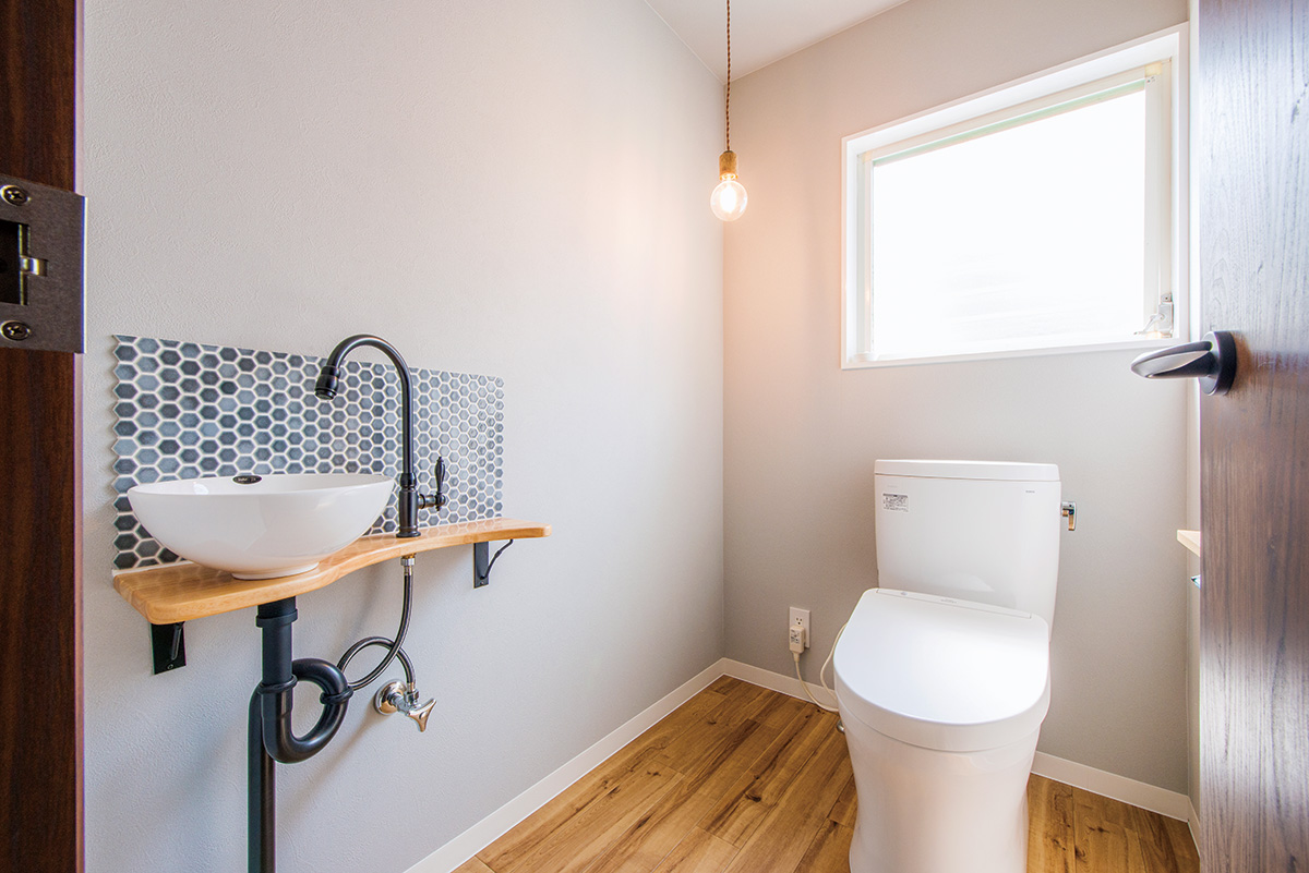 | 2階のトイレも設備やクロス、クッションフロアなど全てを新しく取り替えた。裸電球をつるした照明もおしゃれ | ボウル状の手洗い器とユニークなデザインの水栓、水跳ねを考慮して壁にあしらったモザイクタイルが目を引く |