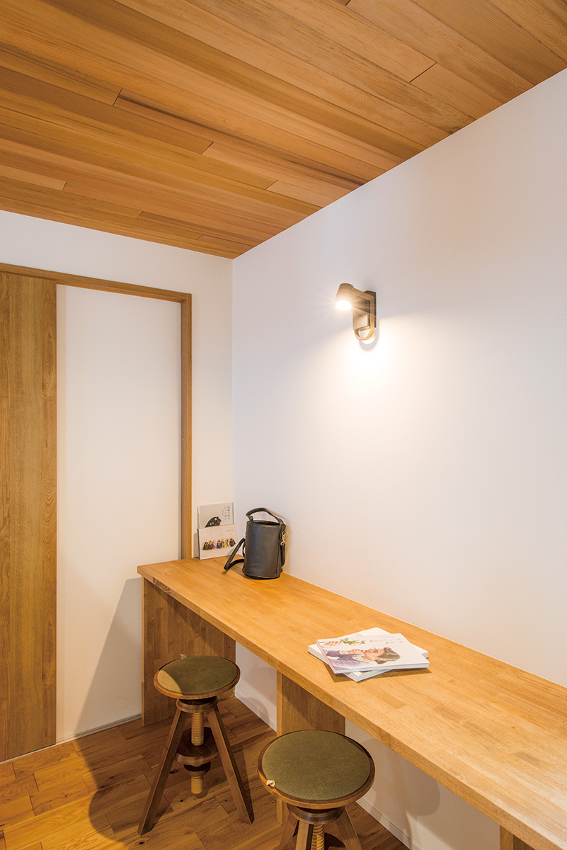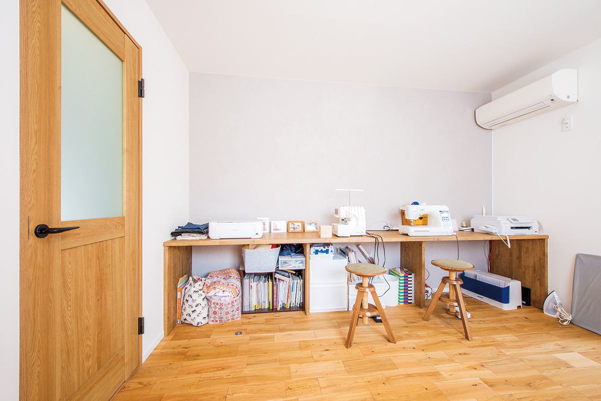 | 書斎の壁際には造作カウンター。ミシンなど奥様が裁縫に使う道具が置かれ、ハンドメードが得意な奥様が作業に集中できる場所になっている |
