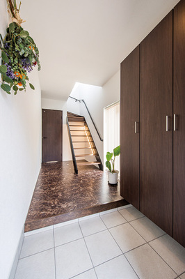 玄関の位置は変更せず、タイルの床から石調のフローリングへ変更。オープン階段が広がりを見せる。 天井までの大型収納を設置した。 |