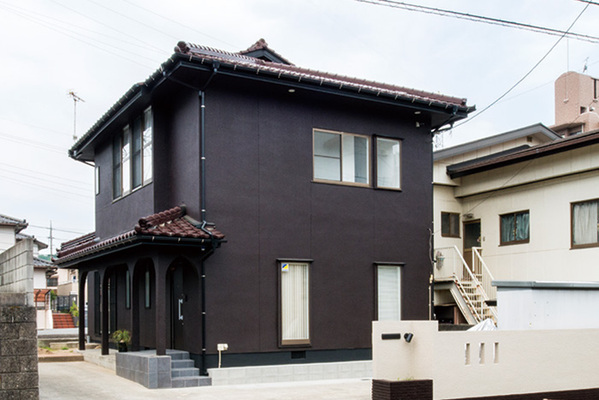 | 1階のトイレは片側の壁にアクセントクロスを採用。床の雰囲気と合わせ、日常の空間に変化をもたらしてくれる。 | 印象的なアールのデザインは残しながら、奥様の希望でブラウン系の外壁塗装を採用。メンテナンスしやすい塗料を選択した。 |
