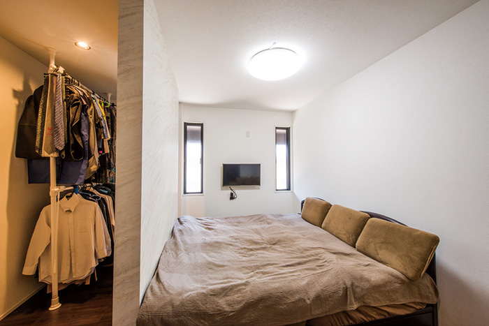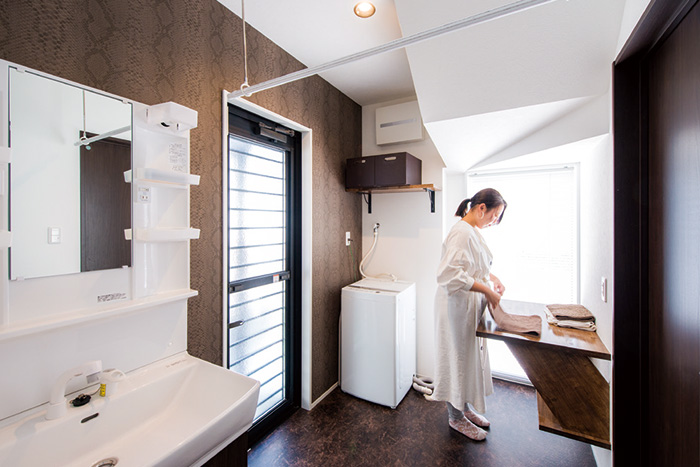 | 広さを増して使い勝手もアップした洗面室。テラスへつながる勝手口、室内干しのポール、洗濯物を畳んで置けるカウンターなど、家事効率も高めるスペースが誕生。 | 夫婦の主寝室を1階に。扉で仕切らないオープンなウォークインクロゼットの壁にはアクセントクロス。寝室の正面にトイレを配して、将来の生活にも考慮した。 |