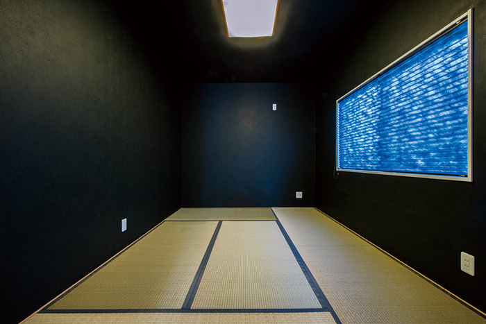 | 以前は教室に使っていた広い洋室。リノベーションで客間や家族の帰省時に便利な和室が誕生。天井まで配したモダンなクロス。既存窓を生かしてカーテンを新調し個性的な空間に。 | 2階には奥様専用の洋室も確保。清潔感のあるプライベートスペースで読書などをゆったりと楽しむ。ワインボトルをあしらったユニークなデザインクロスが目を引く。 |