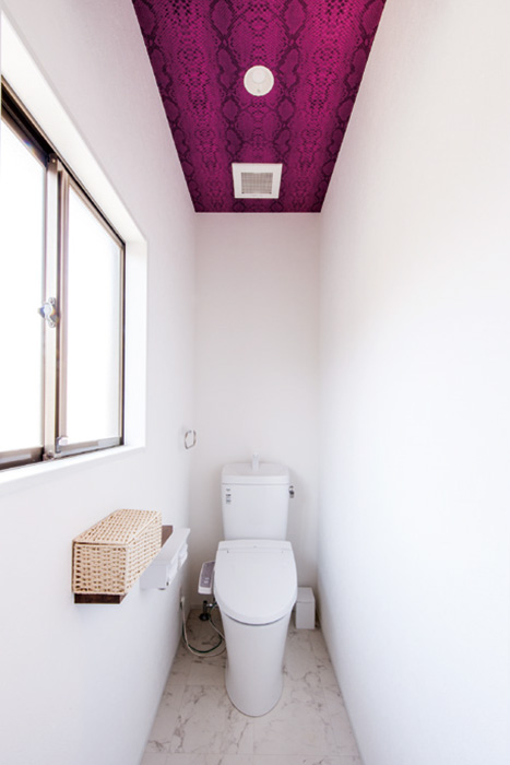 | タイル張りだった浴室を足が伸ばせるユニットバスへ変更。娘さんが1番のお気に入りで入浴時間も長くなったとか。 | 2階に確保したトイレ。シンプルな装いに、足元のデザインフロア、天井のアクセントクロスが視線を引き寄せる。 |