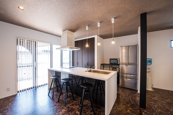 | 1階ホールから廊下・LDKまでの大理石調のフローリングは、シンプルな壁のクロスと引き立て合うインテリアに。奥様が宿泊したホテルの写真も参考にした。 | アイランドキッチンの広いカウンターは、忙しい家族の食卓にもなる。好きな時間に椅子へ座り、一人一人が食事のできる使い方に応えた 。 |