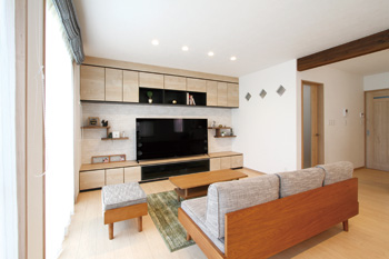 奥様のデザインの希望はウッディでナチュラルな空間。その上で特にこだわったのはパントリーで、壁紙や床材、棚などのこだわりはもちろんのこと、スペースを広く取り、収納だけでなく机も設けて奥様が仕事や趣味に没頭できる場所を新設した。ご主人のこだわりは、以前から雑誌で見て憧れていた壁一面のテレビボード。雑誌の切り抜きを見せながら、担当者とイメージを共有して思い通りのものが手に入ったという。