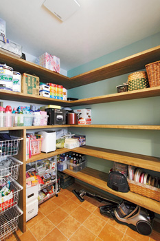 | 大容量のパントリーには食品や奥様の仕事や趣味のもの、掃除道具などあらゆるものが収納可能だ | パントリー内に設けた造作の机。コーディネーターのアドバイスで選んだというクロスは奥様もお子さまもお気に入り |