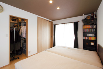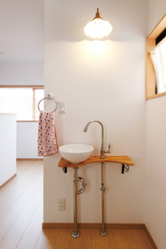| もともと和室だった場所を洋室にして寝室として利用。クロゼットとウォークインクロゼットを新設して大容量の収納を確保 | 2階には、何かと便利な手洗い場を設けた。シンプルなフォルムがおしゃれ |