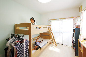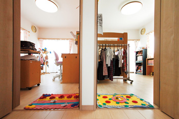 | 子ども室はそれぞれアクセントクロスの色を変えて個性を持たせた。もともとだが、2部屋で1つのベランダを共有しており、ベランダ以外の窓もあるので風通しもいい。 | 入口に敷かれたカラフルでかわいらしいマットは、お子様がデザインした絵を元におばあ様が編んだ手作りのもの |