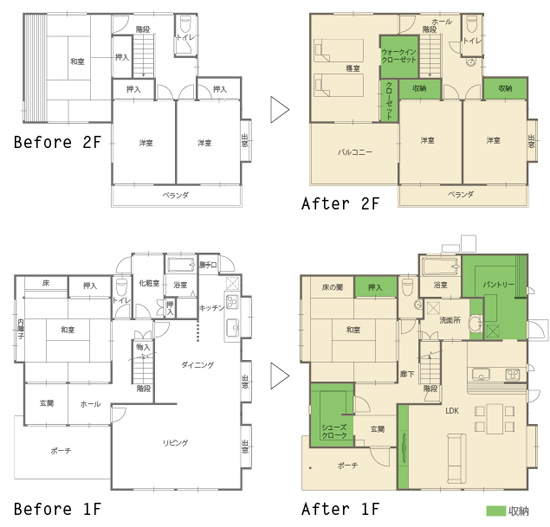 リビング、ダイニング、キッチンと分れていた空間をLDKとして一つにまとめ、奥には少し増築して広々としたパントリーを設けた。キッチンは対面式を採用。玄関は出入り口の位置を変えることで大容量のシューズクロゼットを確保。2階は寝室部分にウォークインクロゼット、増築してバルコニーも設けた。