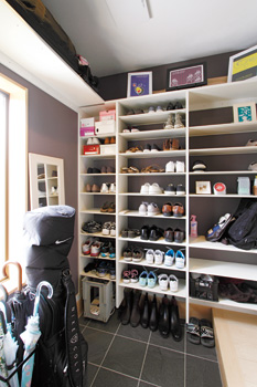 | シューズクロゼットの出入り口はアールに。左側の扉からも出入りができ、家族用として活用。玄関をすっきりと保てる | 靴だけでなく帽子なども収納できるようにと設計されたシューズクロゼット |