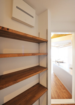 | 浴室などの水まわりスペースにつながる場所に出来たほんのわずかなスペースも、こうして棚を取り付けて活用することで便利な収納空間になる。棚の高さも自由に調節可能。 | 濃いダークブラウンと白で、大人らしいクールな印象を与える浴室。バスタブは1418サイズと大きめで、ゆったり足を伸ばして入浴できる |