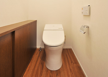 | エントランスを抜けると、斜めに配置されたLDKが目の前に。キッチンシンクは大きめのものを採用。左のガラス引き戸の向こうはバントリー、右は収納スペース、中央は浴室やトイレなど水まわりスペースへの入口になっている。 | トイレはLDKと同じ色合いのダークブラウン&白でコーディネート。奥に広く、収納棚もたっぷりの容量を備えている |