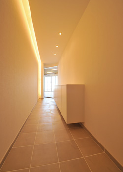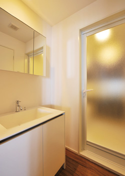 | 浴室とは半透明のドアで仕切られた洗面スペース。あえてシンプルに白で統一しているせいか、広く感じられる | ぬくもりを感じる照明に照らされたエントランス。窓際には床との空間をもたせたフロートタイプのシューズボックス。 |