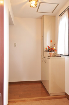 キッチンと並んで、奥さまの大きな懸案事項だった玄関も大きく様変わり。たたき部分にせり出していた下駄箱を取り去り、廊下部分の寸法に合わせてジャストサイズの下駄箱を作ってもらった分、たたき部分が広くなった。