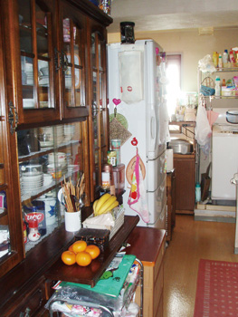 | かつては逆の位置にあったキッチンシンクと収納棚。以前は壁に向かって家事をしていた奥さまも、窓に向かって視界が開けた分、開放感が感じられて喜んでいる | キッチン横に余ったスペースを飾り棚として利用 |