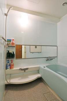 | 洗濯機の上に作りつけた収納扉。2の飾り棚とともに当初のプランにはなかったものだが、マエダハウジング側から提案。洗濯機の右側にはベランダに出られる扉があり、洗濯物がすぐ干せて便利 | 浴室に張った横長の鏡が広さを感じさせる |
