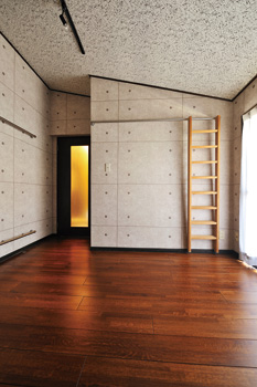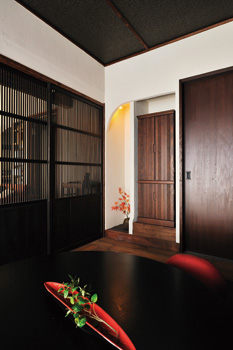 | 猫間障子と格子戸から注ぐやわらかな明かりがゆったりとした落ち着きと、しっとりとした和みを演出 | 無機質なムードのなかにも、どこか温かみを感じさせるシンプルな洋室。奥さまのトレーニングルームやゲストルームなど、多様に使える空間に仕上がっている |