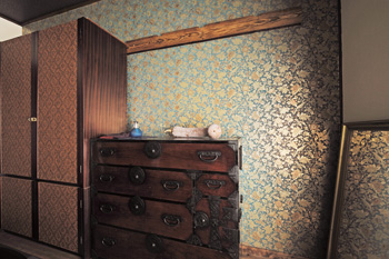 | 特殊な色付けで自然色に染め、美しく織り上げた紙布を扉に張った箪笥。独特のやわらかな風合いが隣の時代箪笥と美しく調和 | 和室の一方の壁にはメタリックウォールを使用。金属の質感を生かしたシャープで洗練されたデザインが高級感を醸し出している |