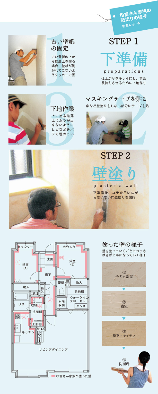 子どもの成長を機に、マイホーム取得に奔走したMさんご夫妻。契約した新築マンションを解約し、新たに購入した中古マンションを自然素材を使ってリフォームした。費用節約のために、ご主人自ら壁塗りに挑戦。その奮闘ぶりと共に、自然素材を使ったリフォームをレポートする。