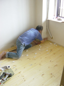 | 無垢パインフローリング゙貼り、無垢の場合は伸縮を考慮して均等に隙間を開けて貼っていきます | 壁の納まり方について、現場監督と大工さんで打合せ |