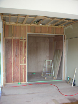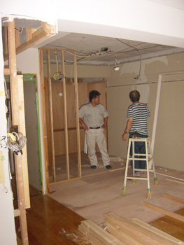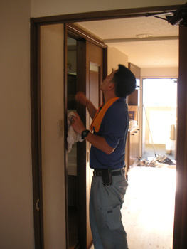| 前は押入れだったところに、広々したウォークインクローゼットを造作。建具枠をつけて部屋らしくなってきました。 | 壁の納まり方について、現場監督と大工さんで打合せ |