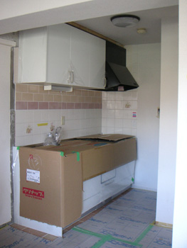 | リビングの壁に珪藻土を塗っていきます。まずは下地から | システムキッチン設置完了。引き出しタイプ収納と食洗器もビルトイン。これからの家事もラクになります。 |