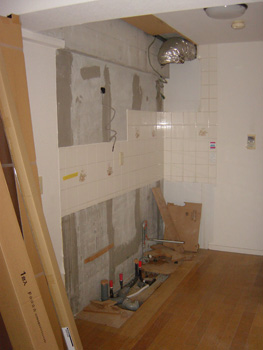 | キッチンも解体しこれから給排水工事、電気工事へと進んでいきます |