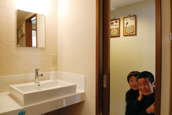 | ご主人が最初に壁塗りした子ども部屋。慣れないコテさばきで凹凸が目立つが、これも珪藻土の持ち味のひとつ | 洗面室の壁はプロ顔負けのキレイな仕上がり。洗面ボウルはご夫妻がインターネットで安く購入したもの |